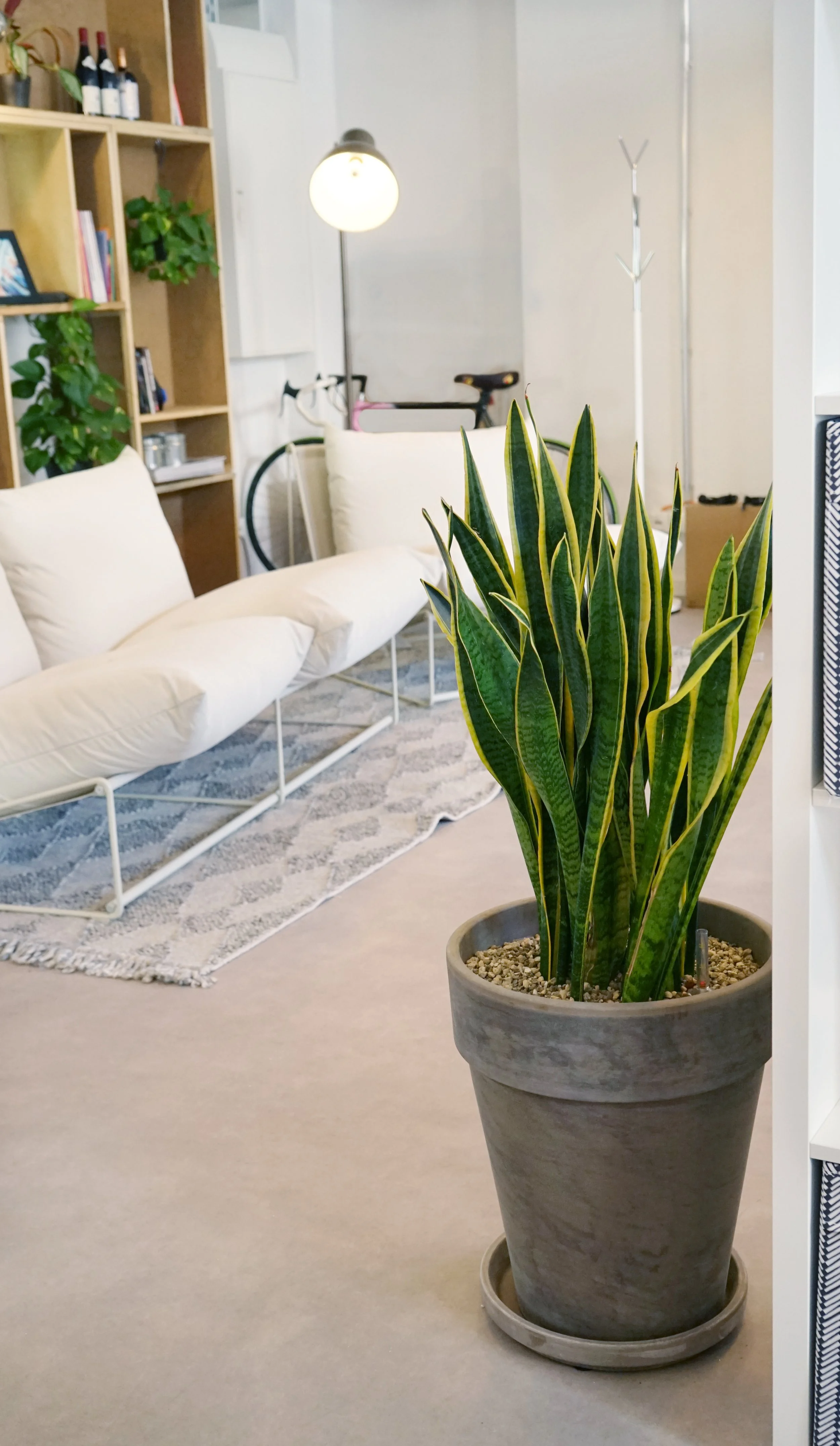 Unser Ziel war es, den Raum zu beleben, ohne den hellen und luftigen Arbeitsplatz zu verstopfen. Kletterpflanzen installiert auf Regalen und an bereits vorhandene Metallschienen bringen Grün in den Raum, ohne die Bodenfläche zu beeinträchtigen. Zusätzlich haben wir mit großen auffälligen Pflanzen in stehenden Töpfen ein Statement gesetzt.