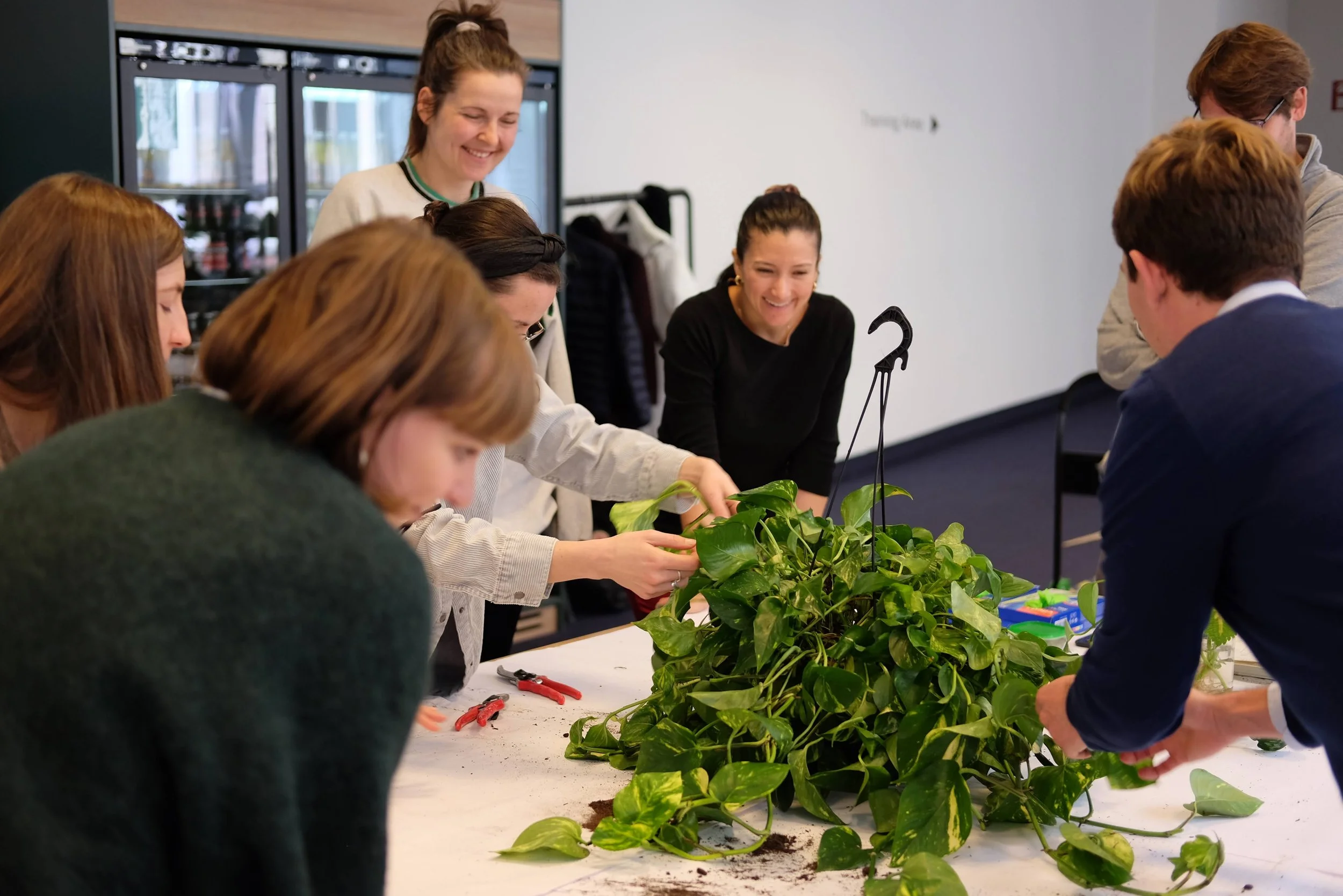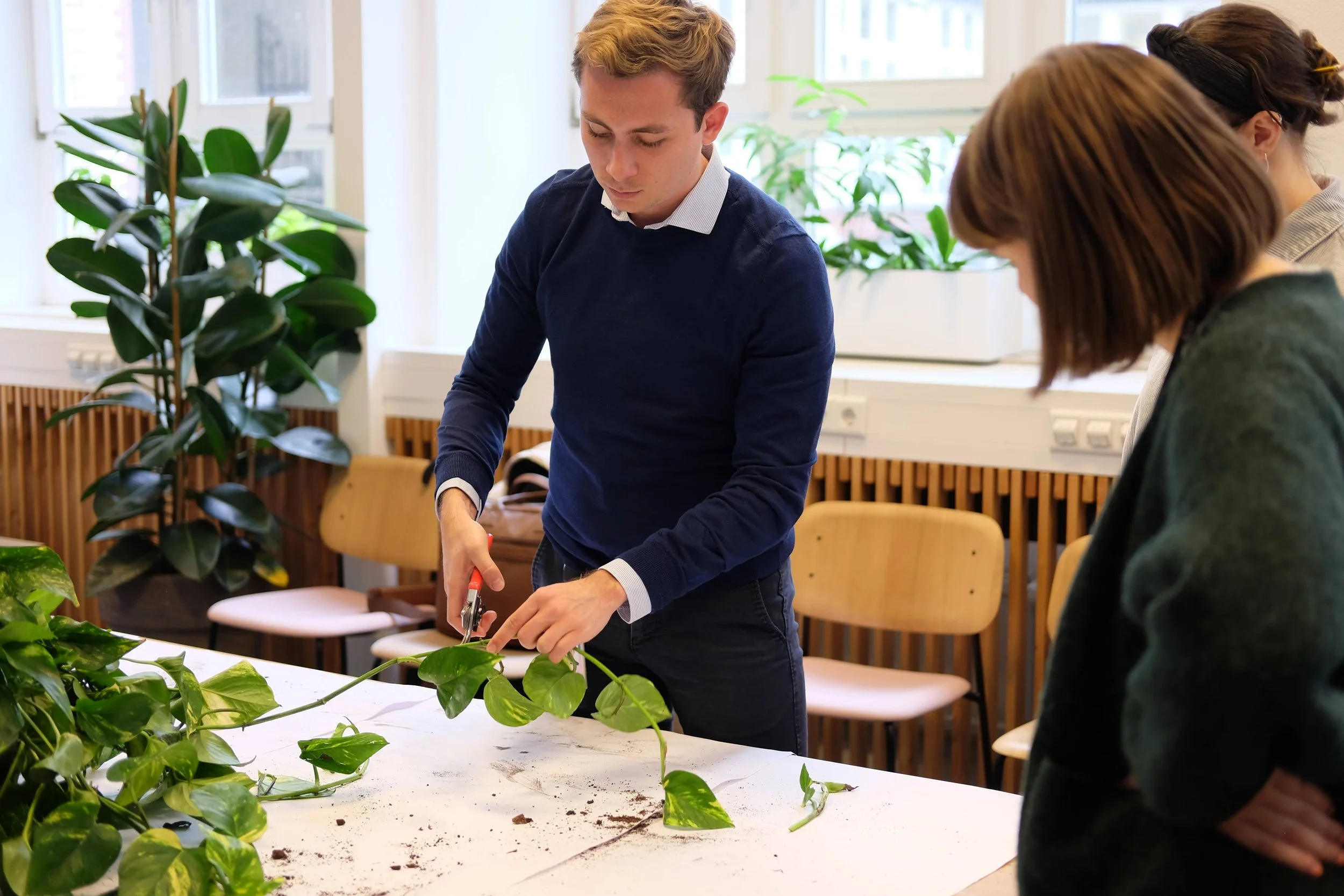 Die engagierten Teilnehmer von N26 konnten Fragen stellen und ihre neu erworbenen Kenntnisse aus erster Hand ausprobieren, indem sie eine wuchernde Efeutute stutzten, im richtigen Winkel schnitten und am Ende einen Steckling mitnahmen, um zu Hause ihre eigene Efeutute zu züchten.